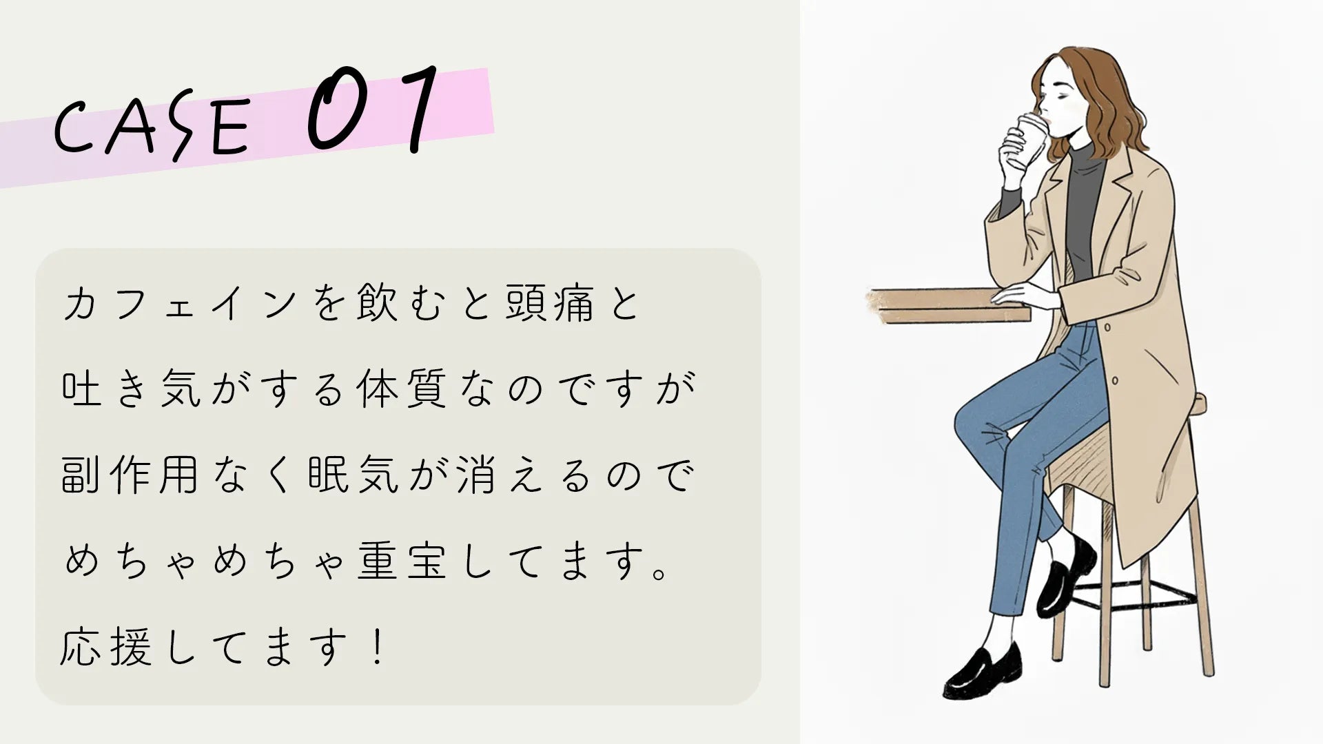 今年に入ってから急に生理前の眠気が強く出るようになり、コーヒー飲み過ぎ防止のために購入させていただいてます。とても美味しかったし短時間なら集中力を保ててる感じもしました!