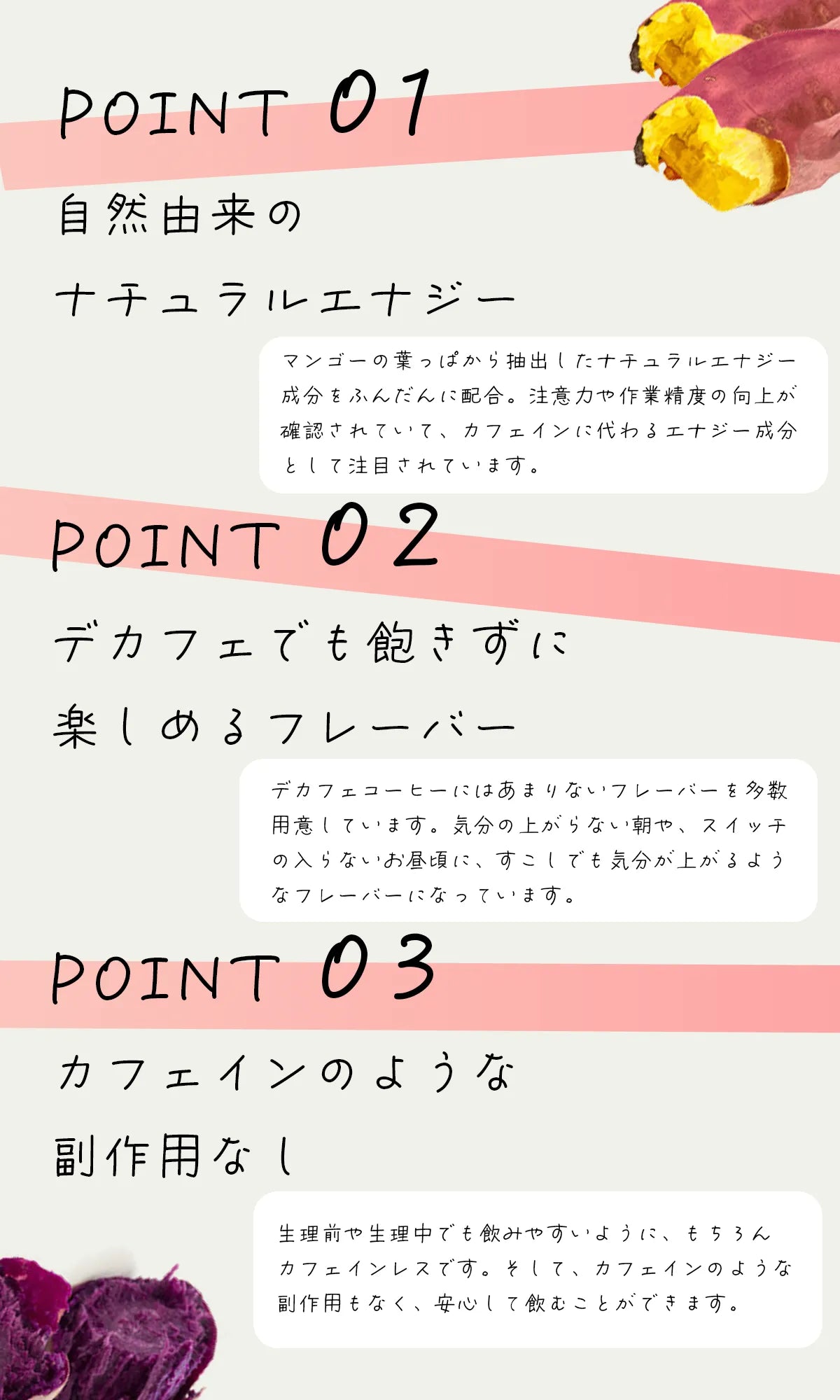 カフェインに代わる新素材「マンゴー葉乾燥エキス」を配合することで、カフェインを控えつつ、エナジー効果を期待できる新感覚デカフェコーヒー。